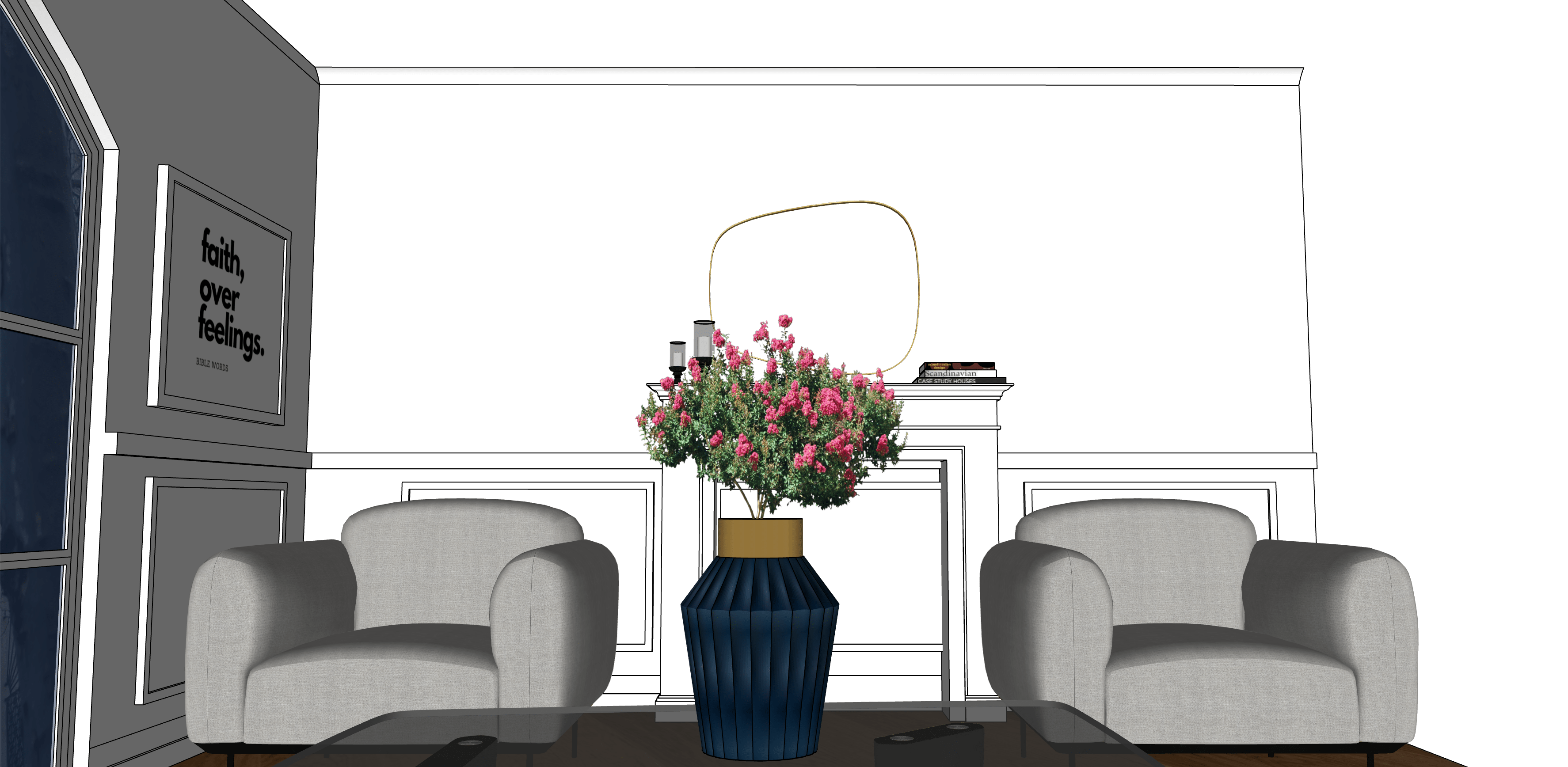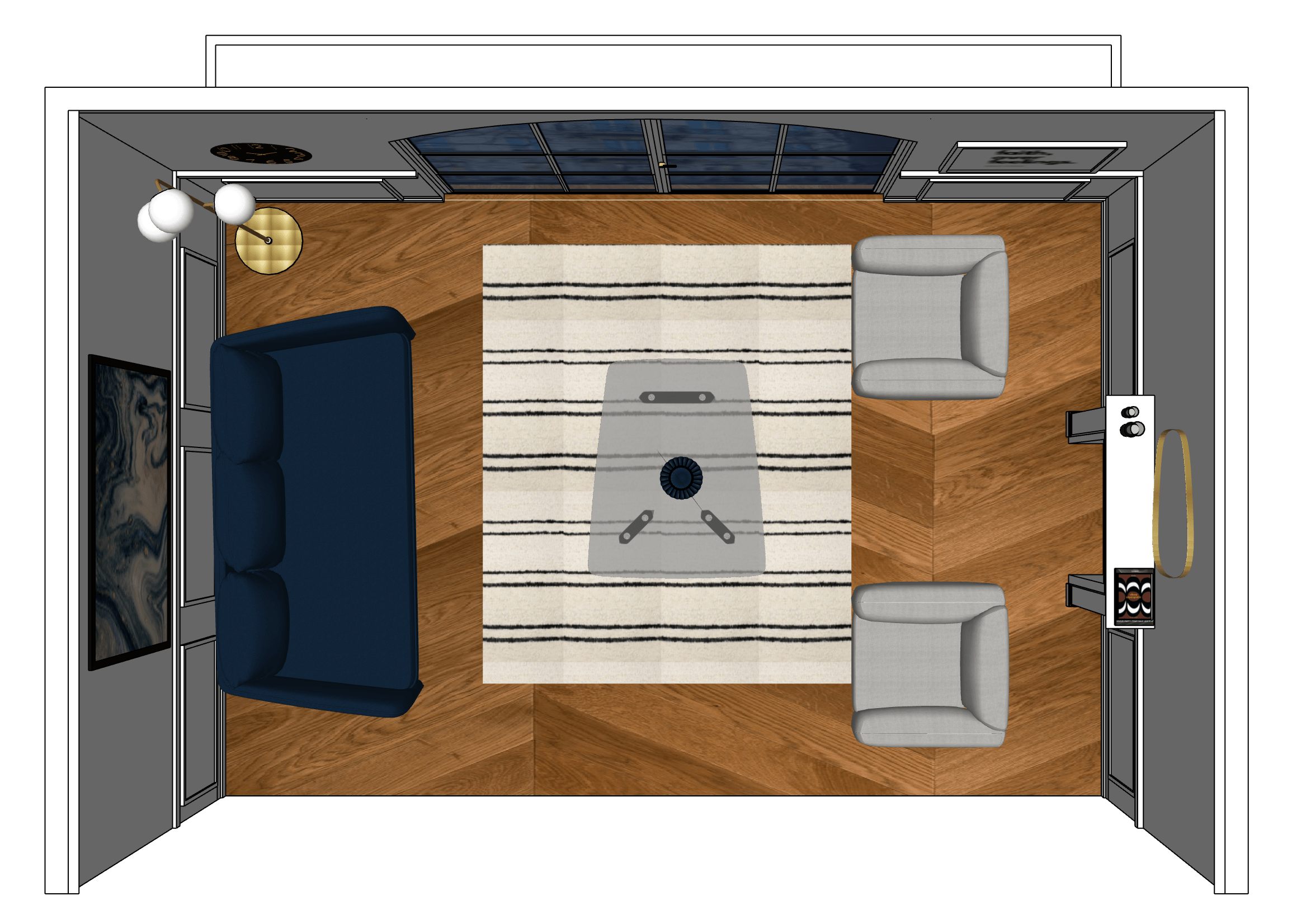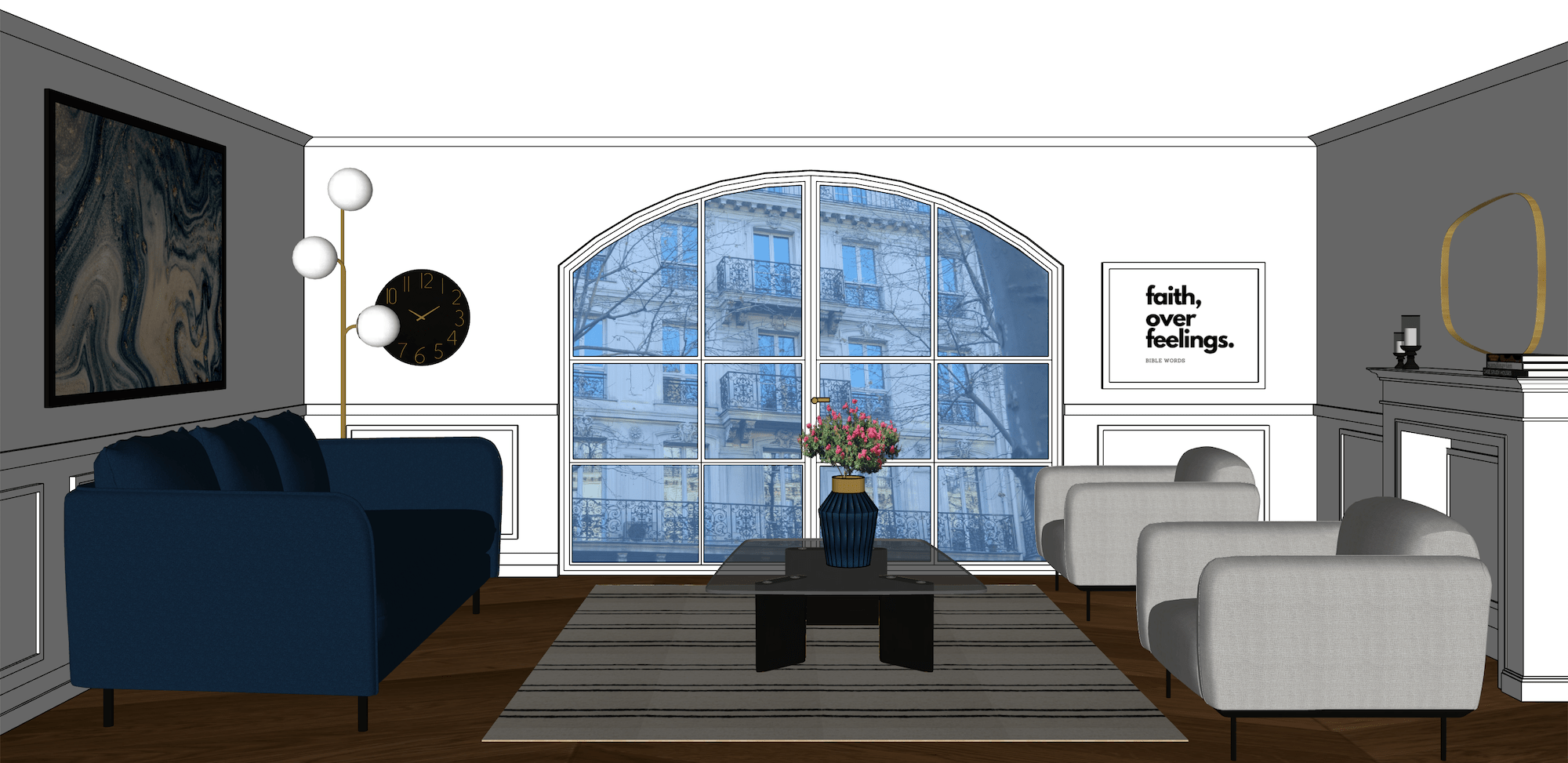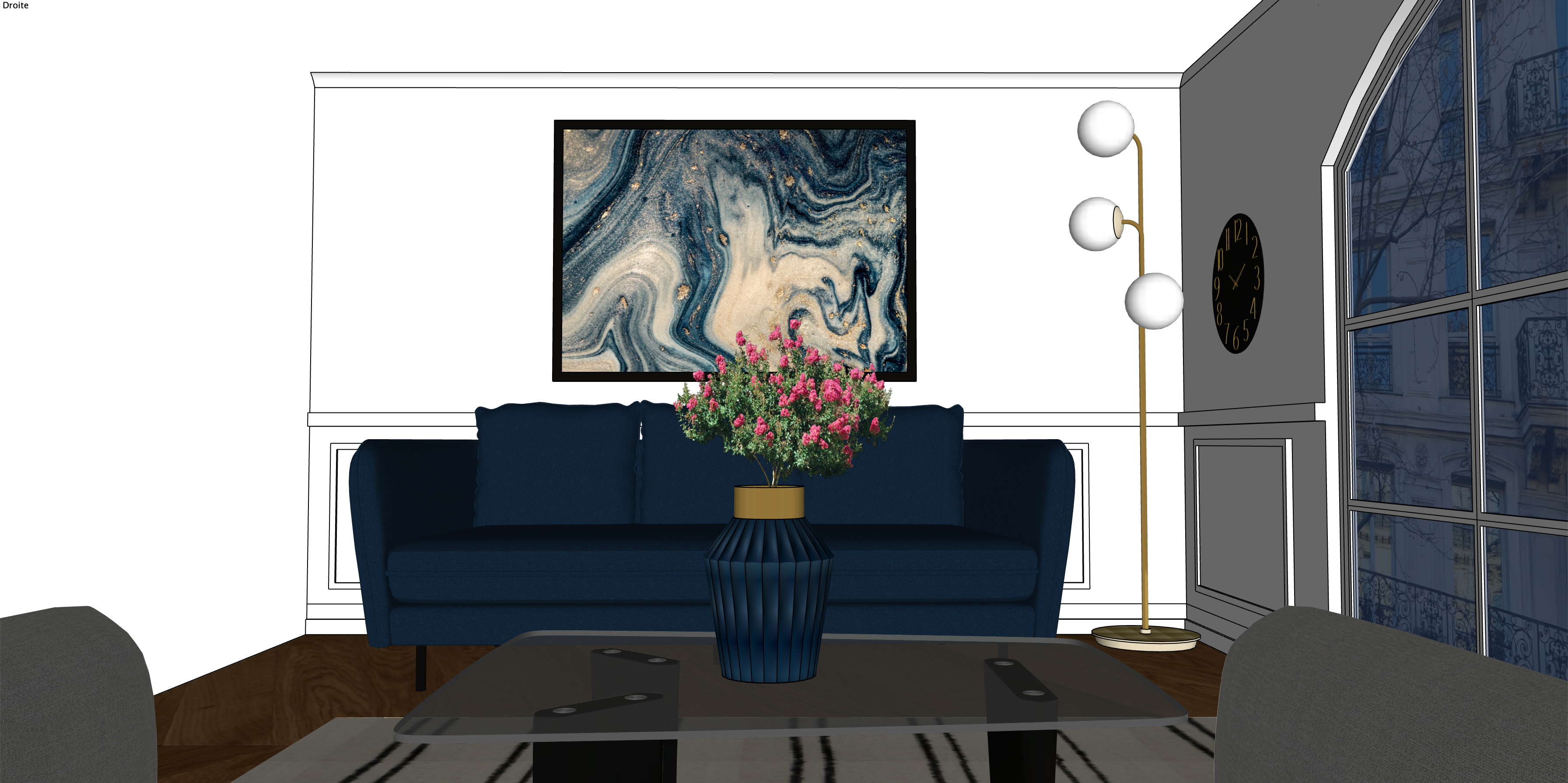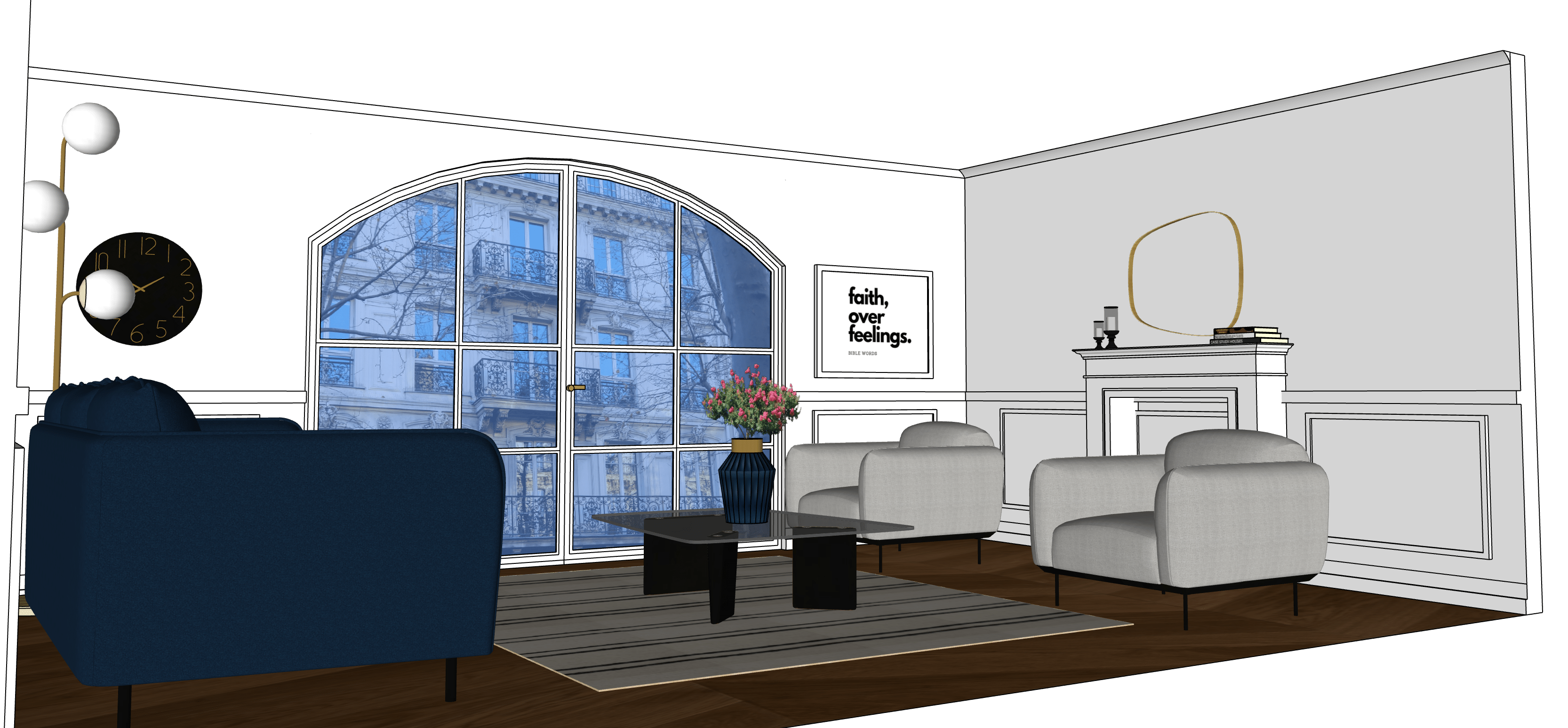- Le souhait : La cliente souhaite mettre en avant les traits haussmaniens de son futur séjour tout en intégrant du mobilier contemporain et une décoration moderne.