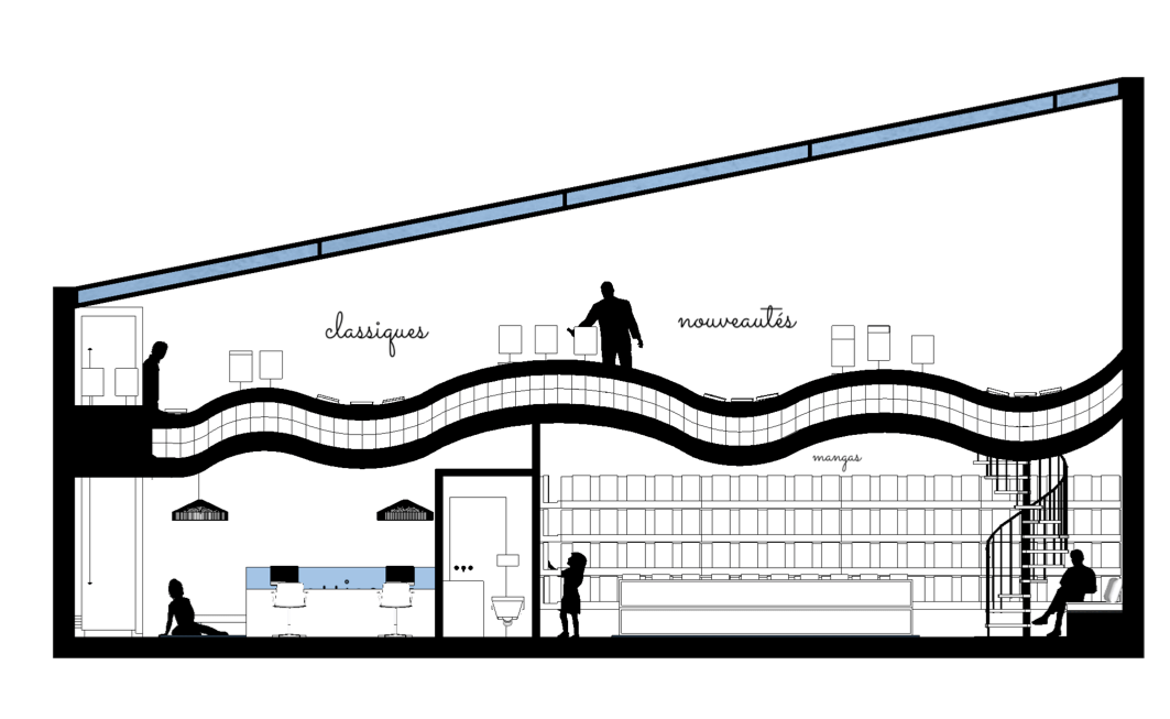 Le projet consiste à concevoir une libraire dans un bâtiment disposé tout en longueur et tout en pente.