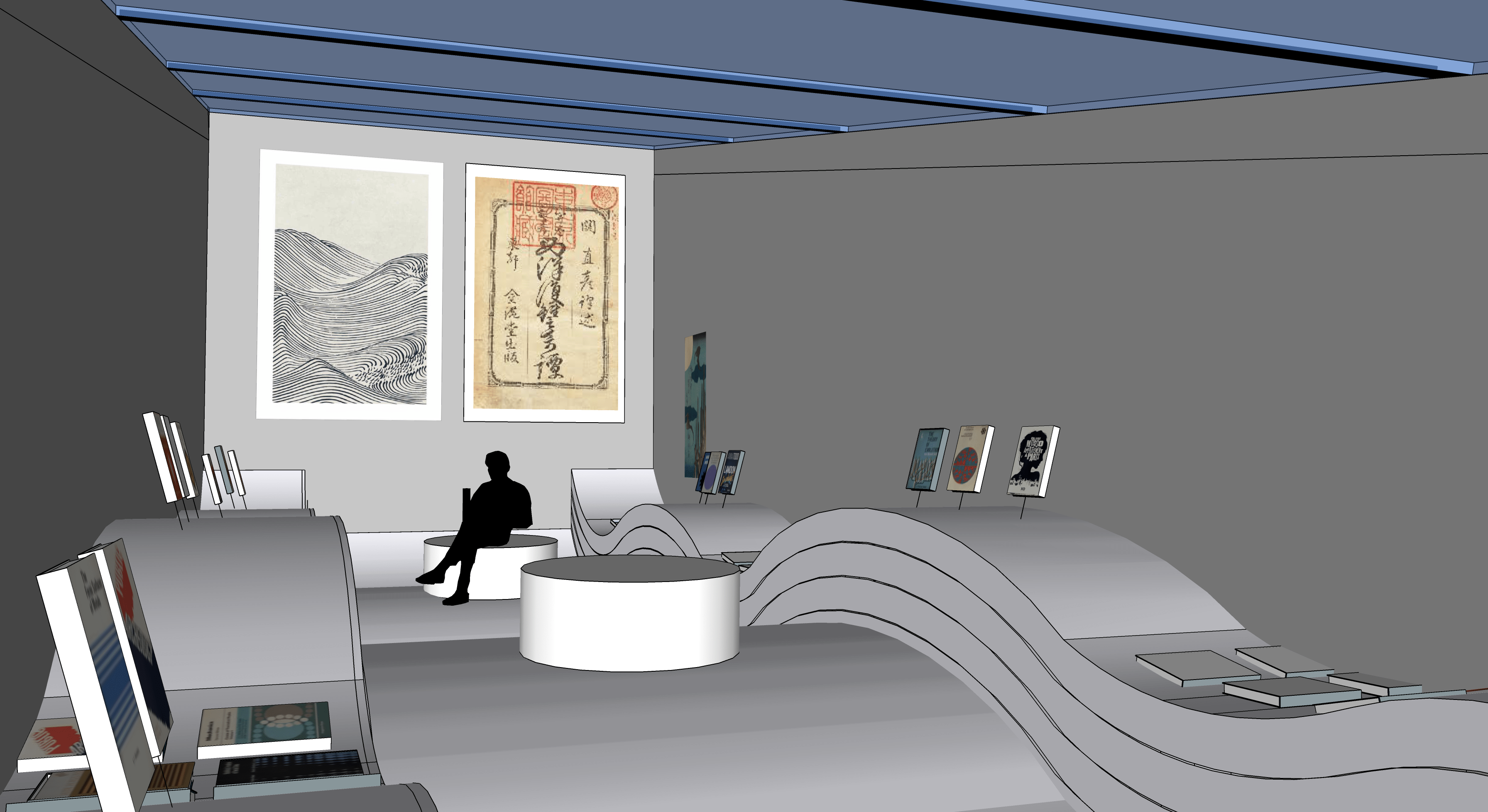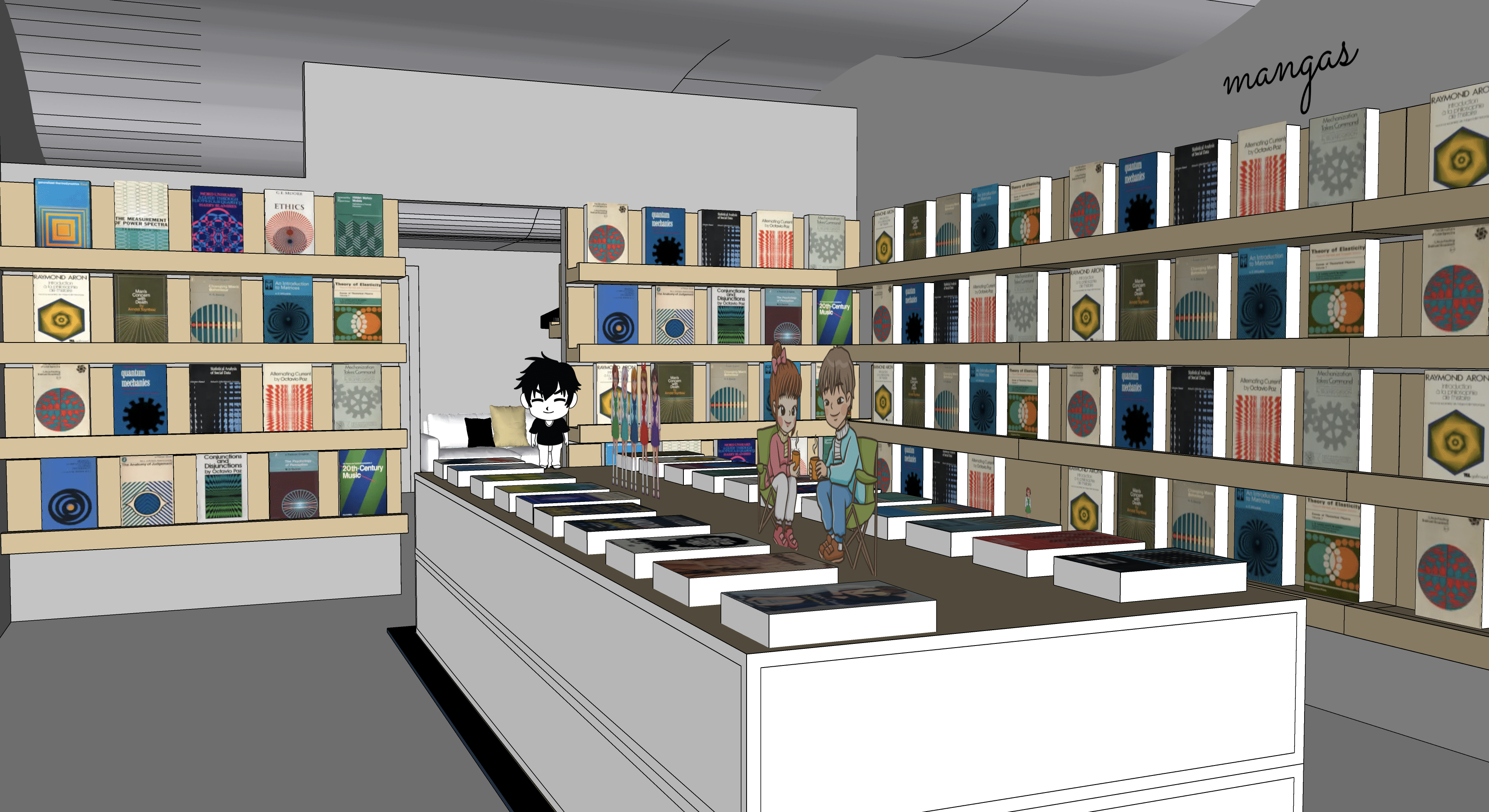 - Le souhait : Les clients sont un couple japonais-suisse qui souhaite pouvoir disposer dans cet espace un grand choix de littérature spécialisée japonaise et suisse, avec un grand choix de livre pour enfant, BD, mangas, romans de fiction, livres d’art. Il souhaite pouvoir exposer de manière intégrée de l’art graphique dans des cadres parmi les bibliothèques de la librairie. Le couple a exprimé l’envie de de créer un petit espace de lecture ludique et atmosphérique.