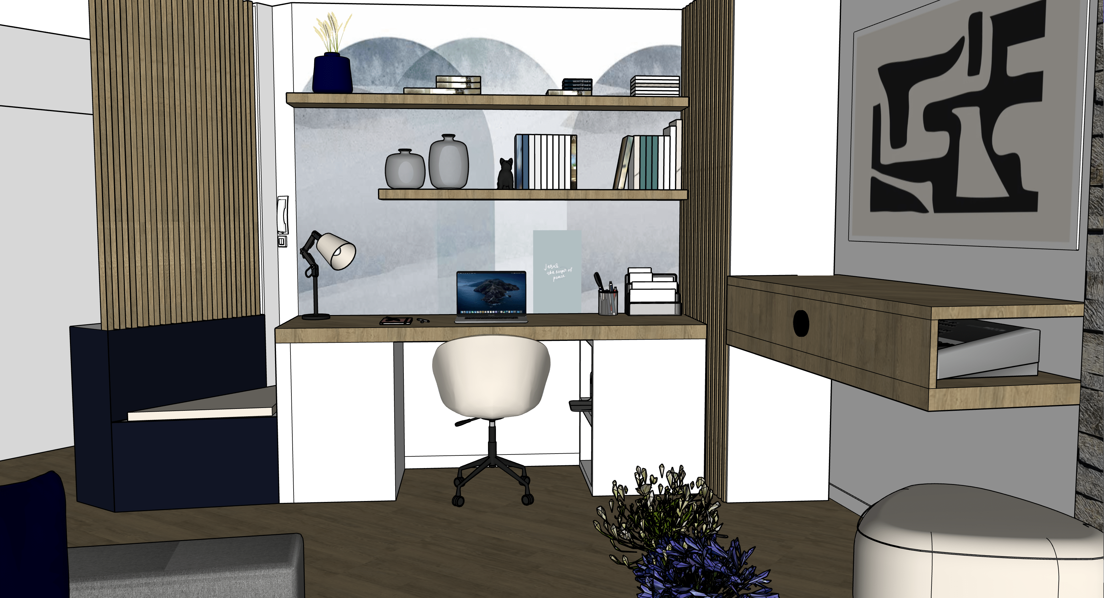 - La solution : Après avoir précisé les couleurs et identifié les contraintes du séjour au domicile de la cliente, nous avons proposé un mobilier sur-mesure adapté à la forme atypique de la pièce. Du claustra pour délimiter l’entrée, des placards fonctionnels et un plan de travail en bois pour créer l’espace bureau non loin du coin musique. Afin de dynamiser l’ambiance, nous avons associé le bleu nuit (déjà présent sur le mobilier de cuisine) avec des touches de terracotta vif, le tout relevé par quelques éléments en laiton doré.