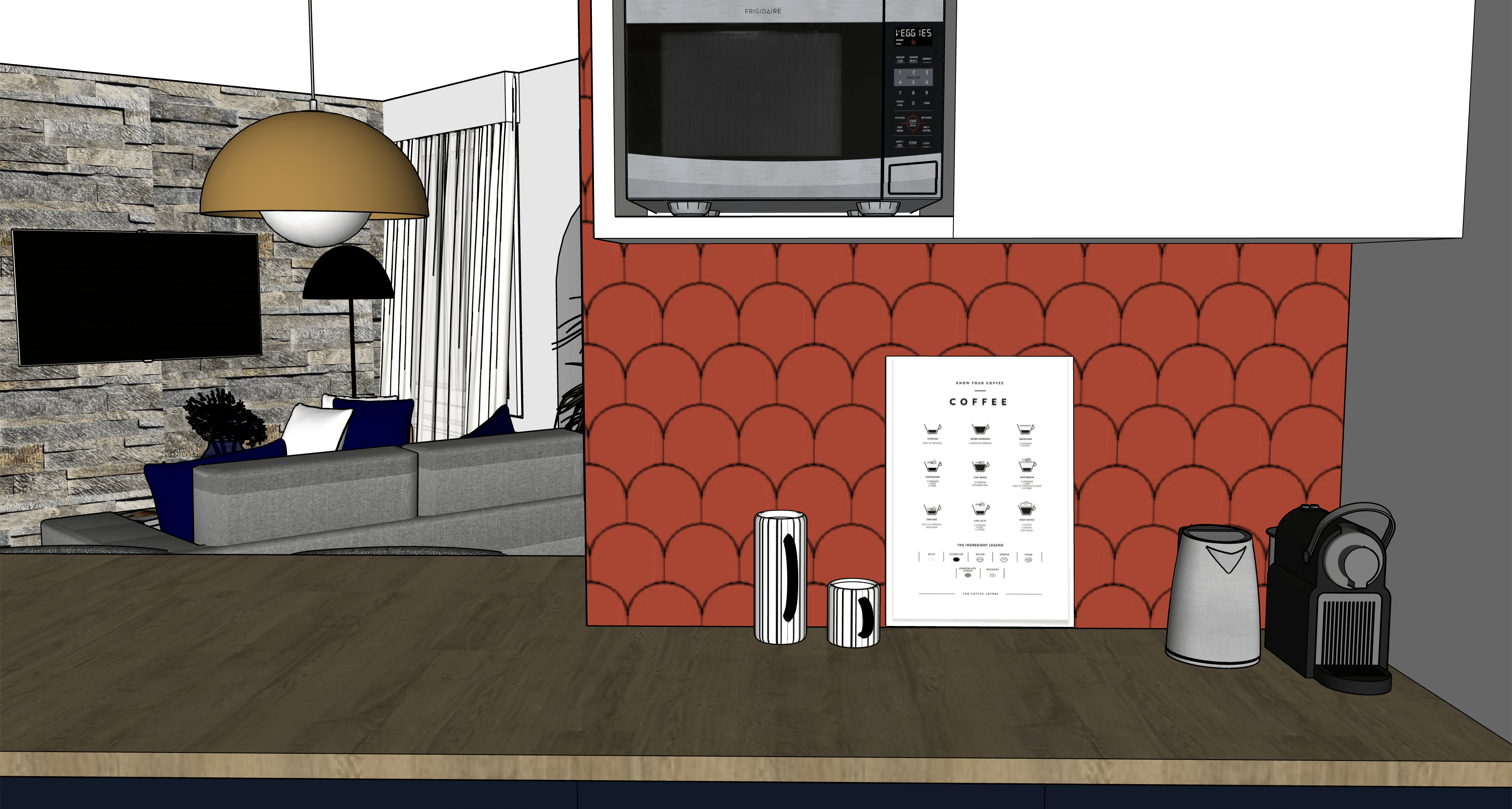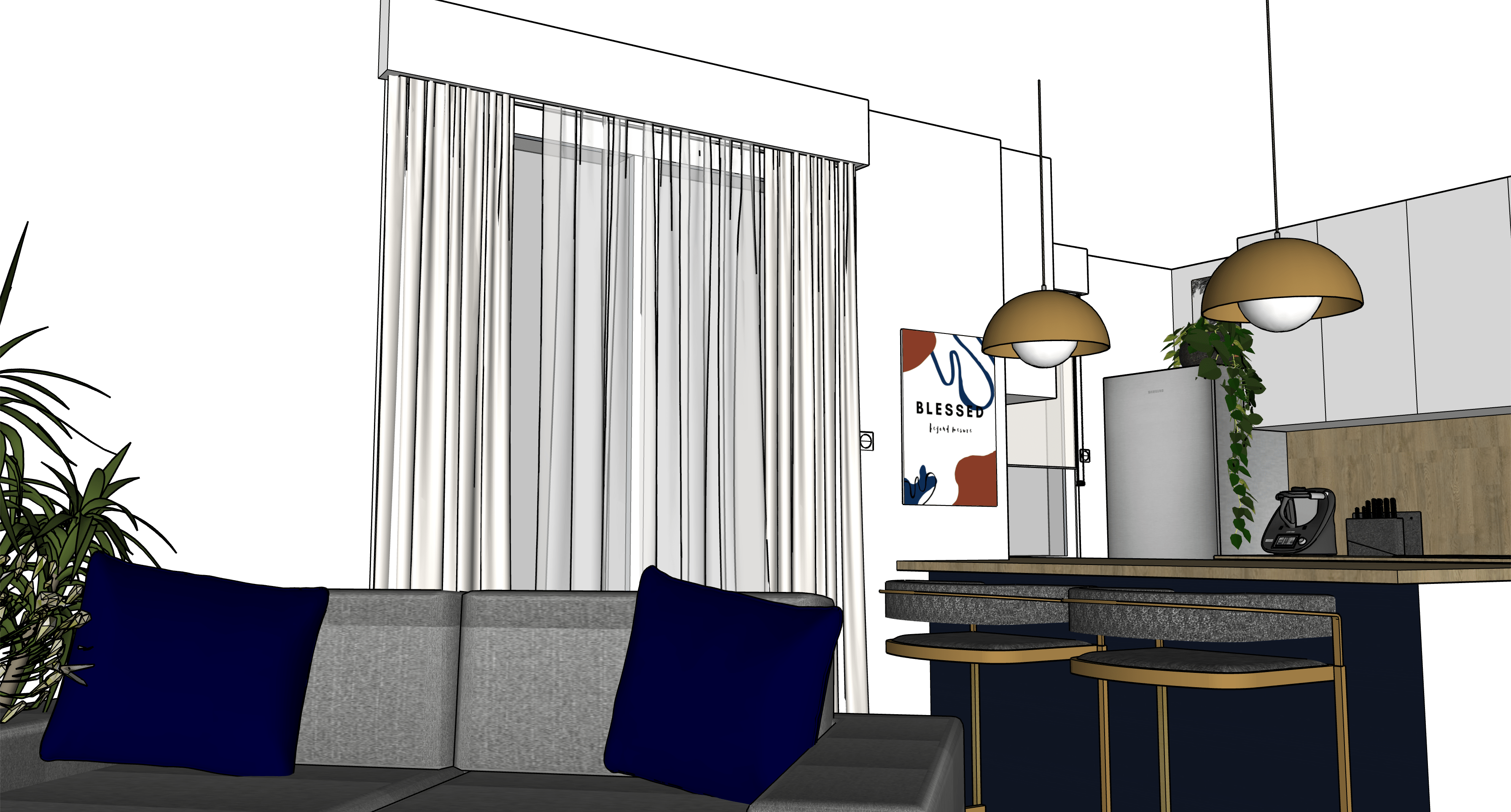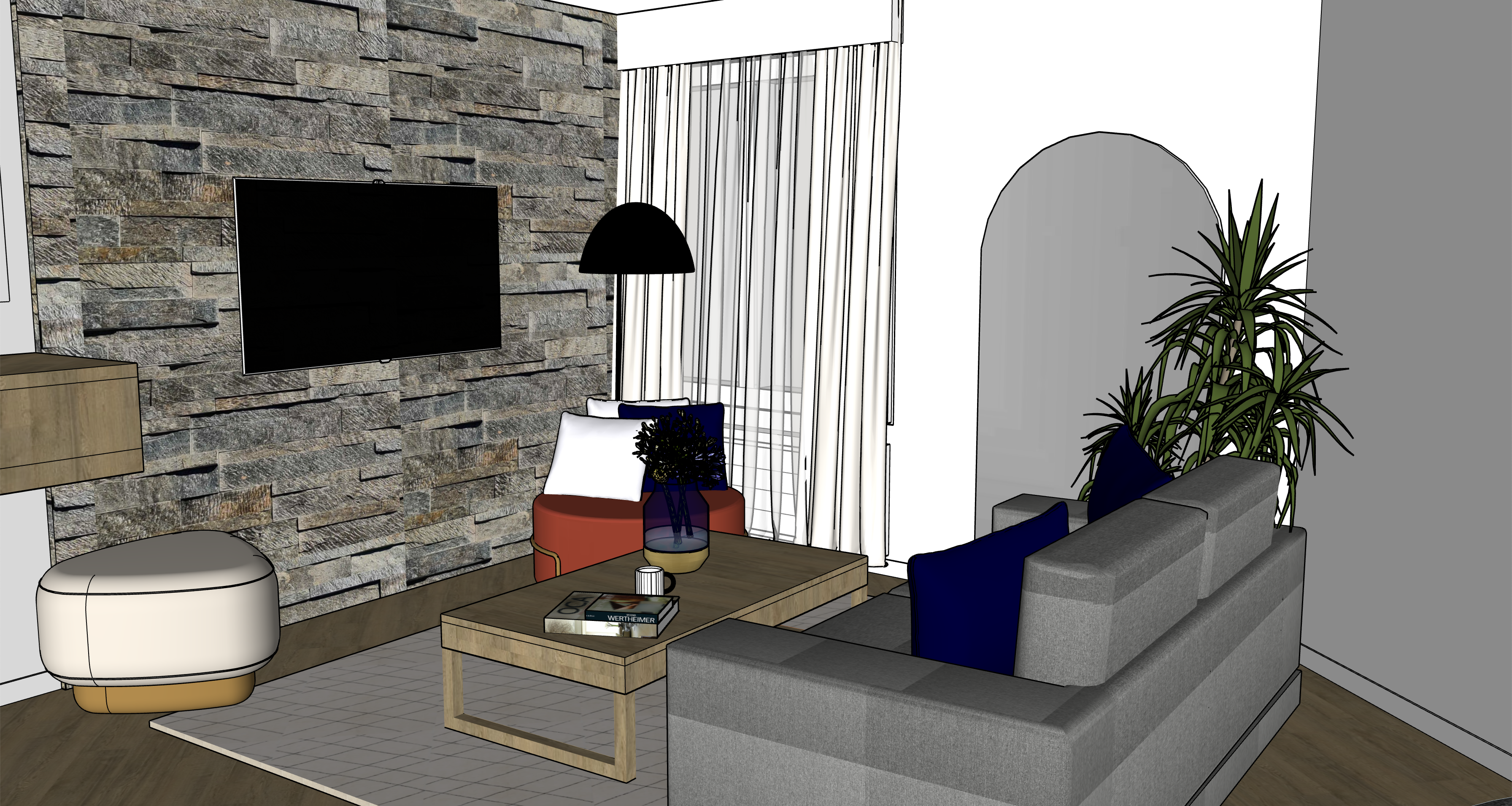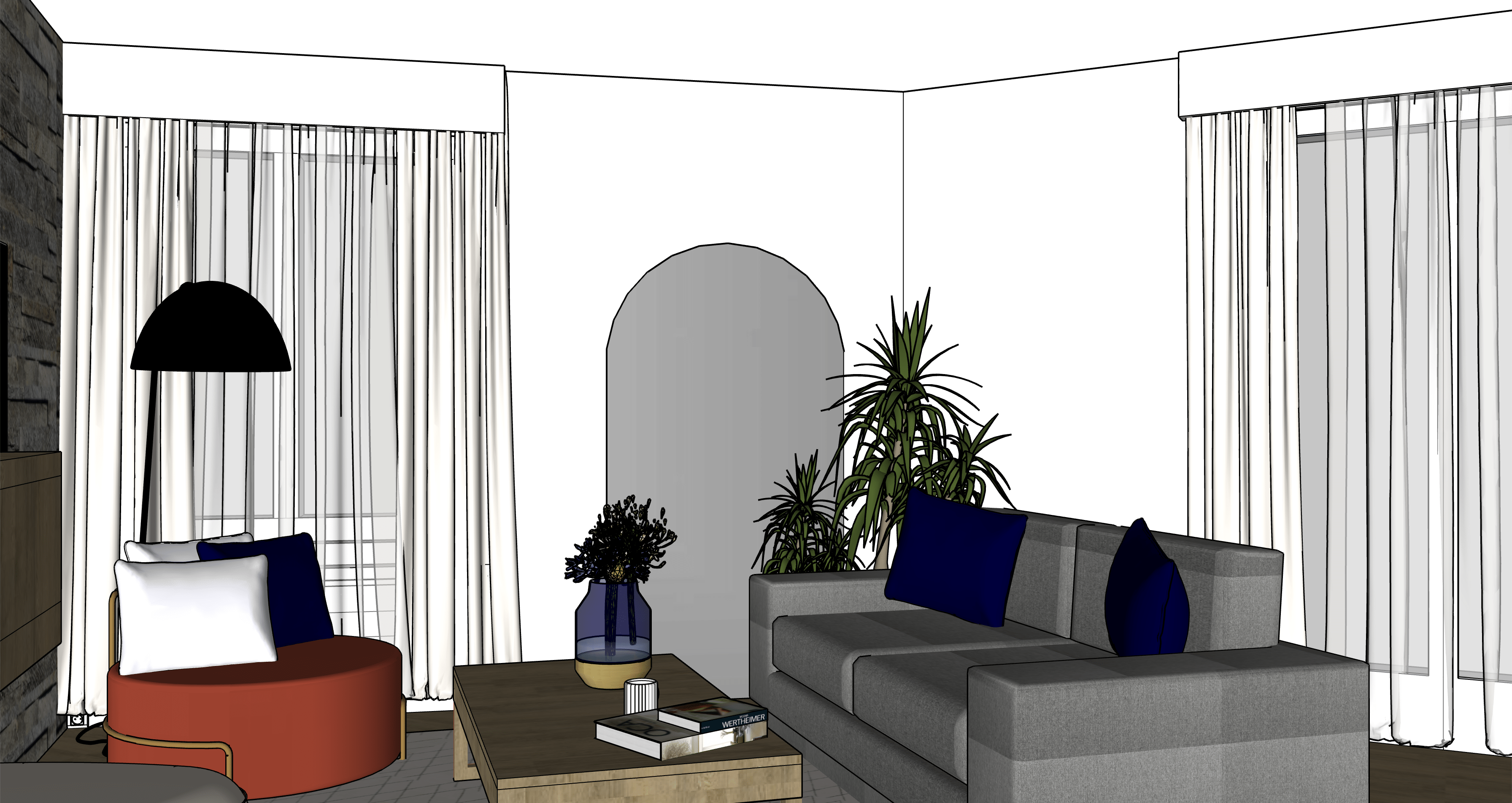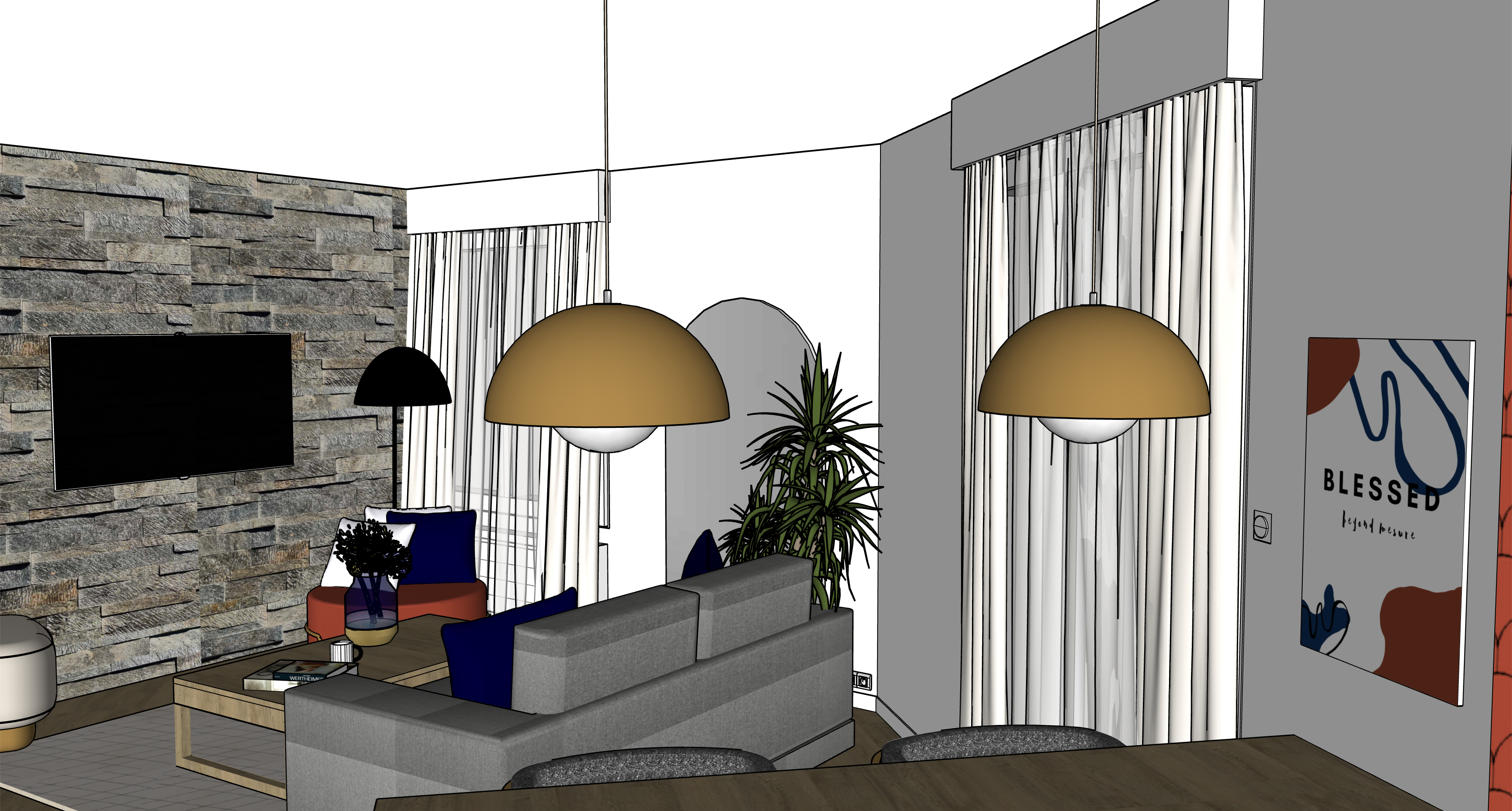 - Le souhait : La cliente souhaite un séjour multifonctionnel avec une décoration éclectique aux touches de couleur assez marquées et dynamiques.